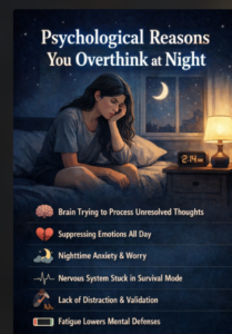 Night-time overthinking isn’t a weakness, a bad habit, or a lack of discipline. It’s often a psychological response rooted in how the brain processes stress, safety, and unresolved emotional experiences. When the day ends, your brain finally has the space it didn’t have before—to process what was postponed, suppressed, or emotionally unfinished.